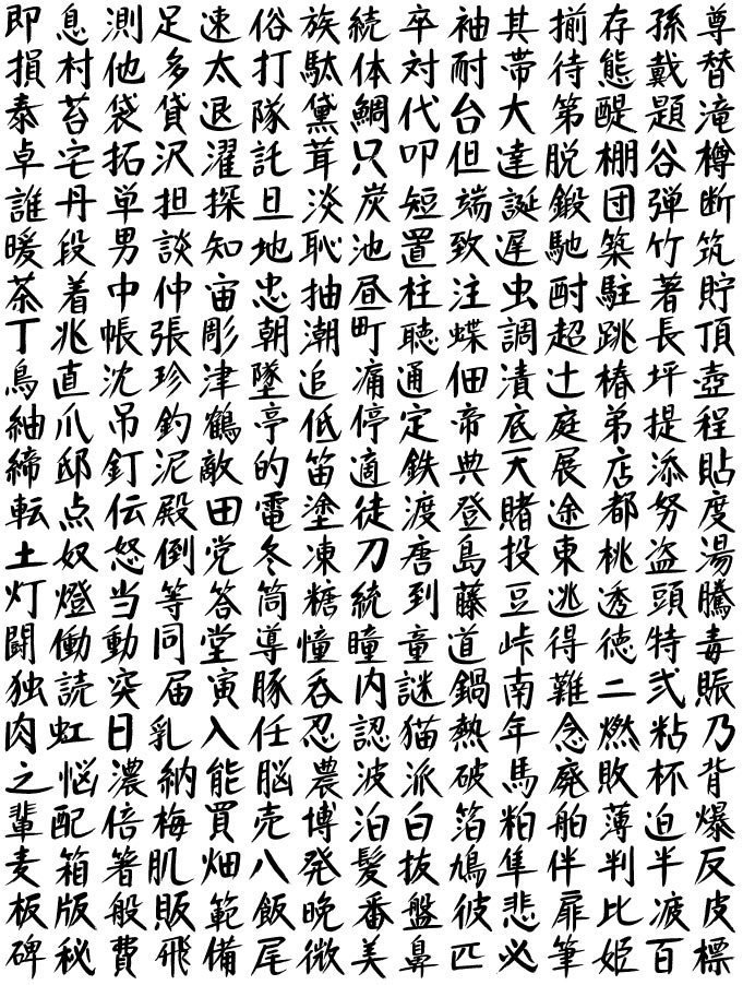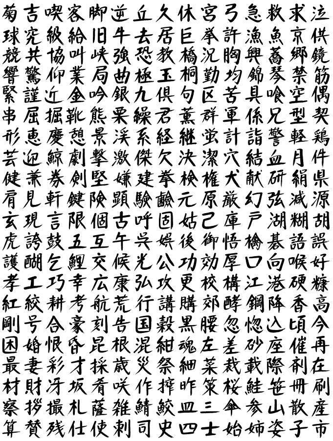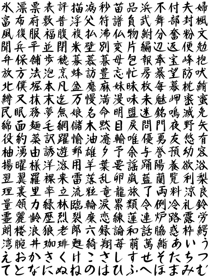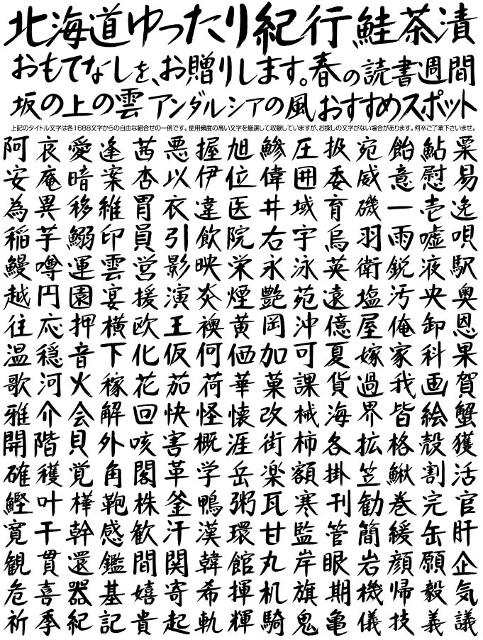 筆文字アウトラインデータ1688文字を、お求めやすい価格で提案します。 チラシ、パンフレット、看板などのタイトル作成、 お店や新商品等のロゴタイプ、ウェブデザインなどに、 ご自由に使用いただけます。 コピーアンドペーストで拡大縮小、着色自由、印刷物対応。 (Adobe Illustrator 8.0以降対応・win/macハイブリッド対応)